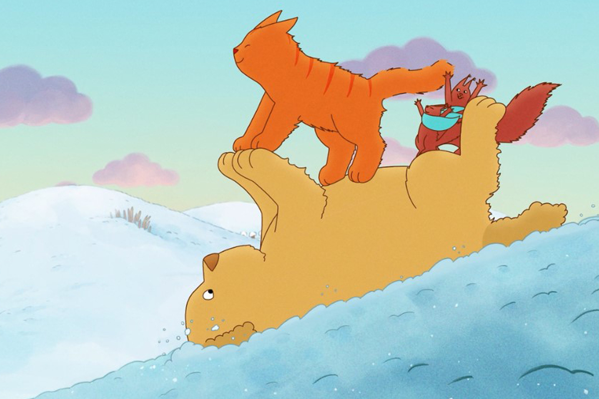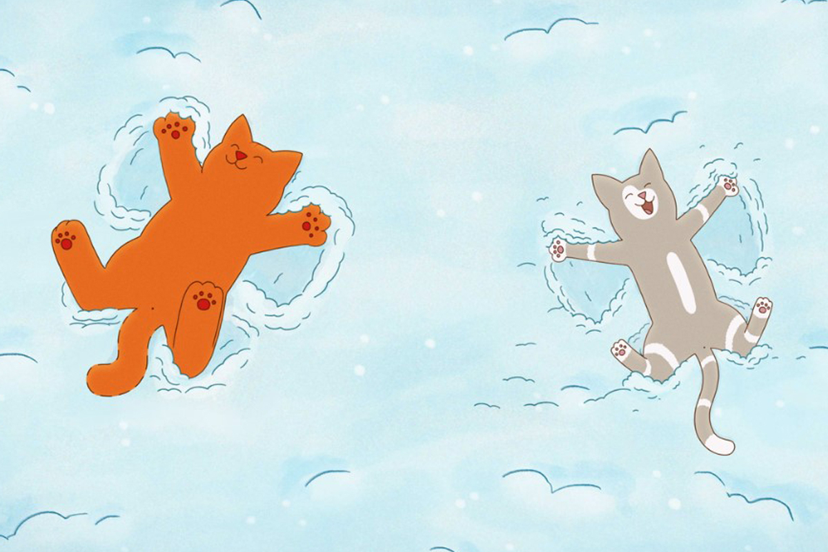 Följ med Tommy Tass och hans vänner när de en vinterdag upptäcker något nytt: snö! Dessutom har det också flyttat in en ny granne – en stor, högljudd hund som heter Voff. Brr! Det tycker katterna inte alls om!